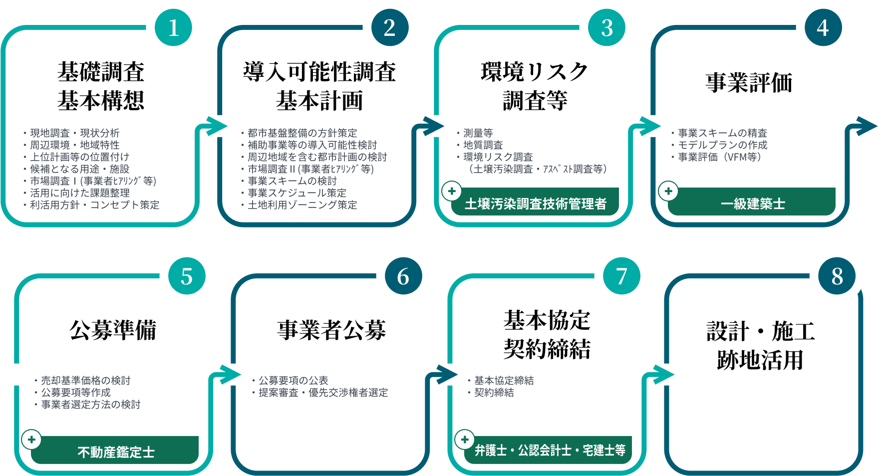 なお、不動産事業の推進には高度で多面的な知識・知恵等に基づく支援が必要ですが、弊所内に各種専門家(不動産鑑定士、一級建築士、宅地建物取引士、弁護士、公認会計士等)が所属しており、事業に適したチーム編成のもと、総合的かつ的確に事業の推進支援を実施しており、事業の実現性の観点から高い評価を得ております。