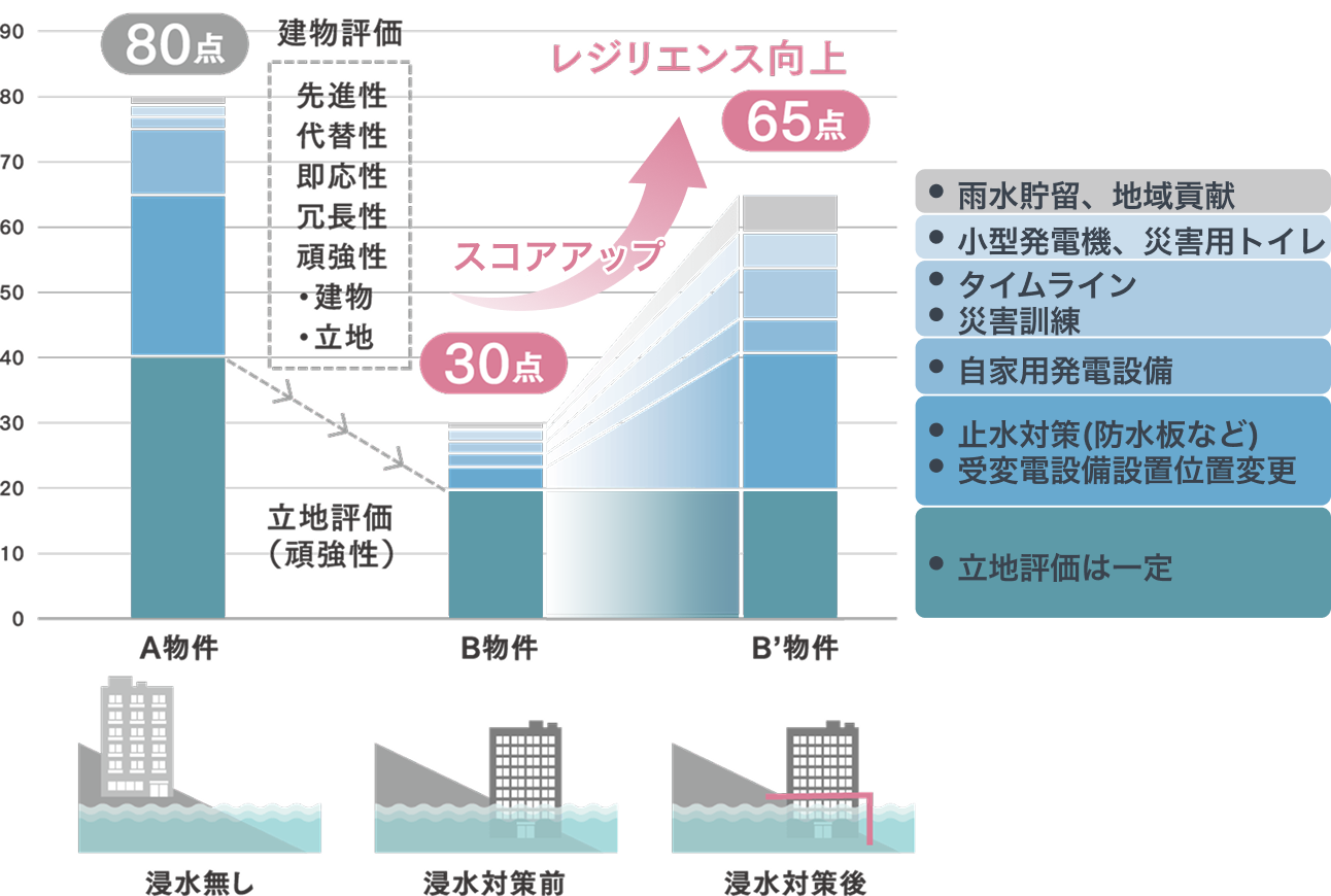 各自然災害に対する不動産のレジリエンスは、立地や建物の性能などのハード面だけでなく、災害時用の備蓄や防災訓練などのソフト面も考慮し、総合的・定量的にその内容を評価します。 そのため、立地上リスクのある物件や一度評価を受けた物件であっても、対策の実施などにより評価結果を改善できる可能性があります。< 水害を例にした評価と対策によるレジリエンス向上のイメージ >