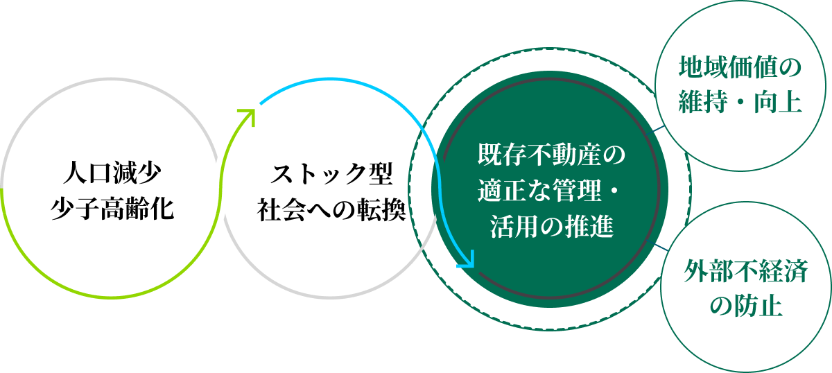 少子高齢化・人口減少が進展するなか、持続可能な地域の未来を創ることが求められています。地域は不動産の集合体ですが、いま、全国で、空き家や空き地、老朽化マンションなど、管理の担い手不足が顕著な不動産が急増し、不動産の再生や最適な活用、周辺への危害等を防止するための取組が喫緊の課題となっています。