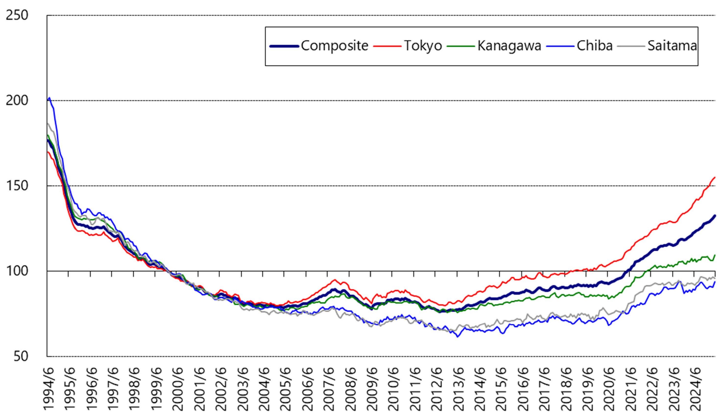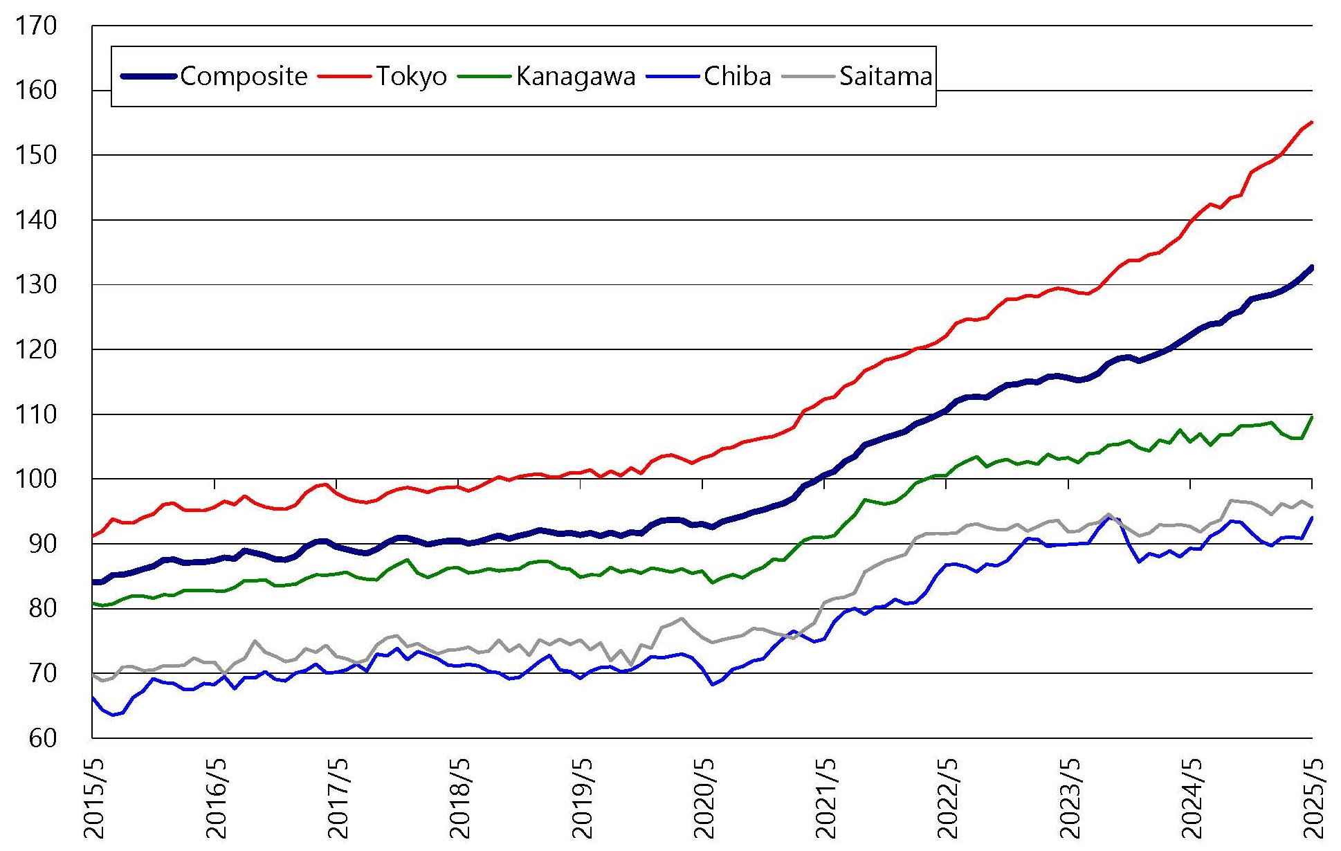 不動研住宅価格指数のうち首都圏総合は132.67ポイント(前月比1.18%)で17ヶ月連続上昇、地域別では、東京が155.10ポイント(前月比0.72%)で9ヶ月連続上昇、神奈川109.53ポイント(前月比3.05%)、千葉94.02ポイント(前月比3.53%)、埼玉95.68ポイント(前月比-0.91%)でした。