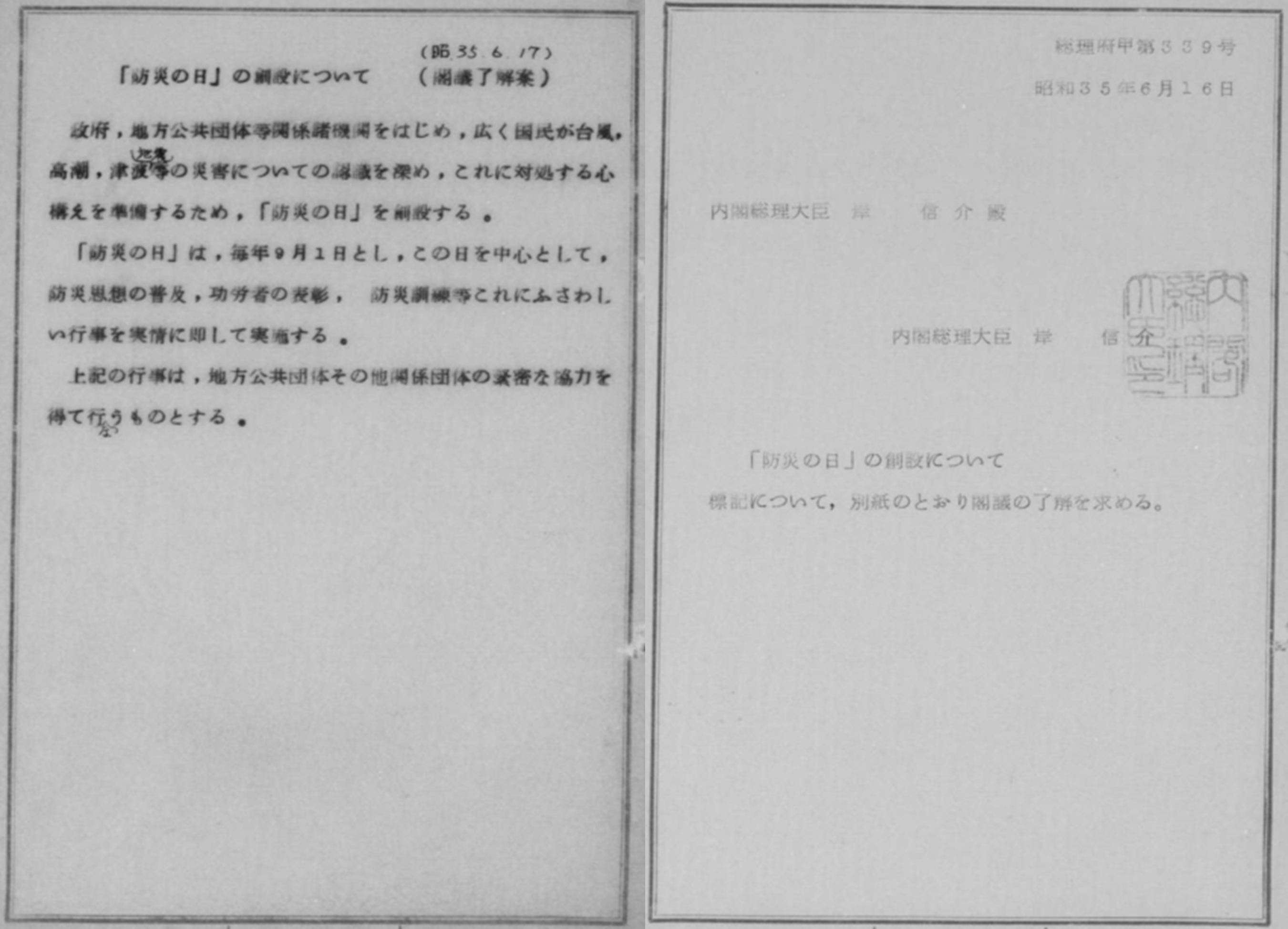 「防災の日」は昭和35年(1960年)の閣議決定により創設されました。この日は上記のとおり関東大震災が発生した日です。そこで、当時の閣議決定の書面を確認してみました。すると、文書には「地震」は手書きで書き加えられているほか、「台風、高潮、津波等」とあり、水害に対する防災が想定されていたのです。