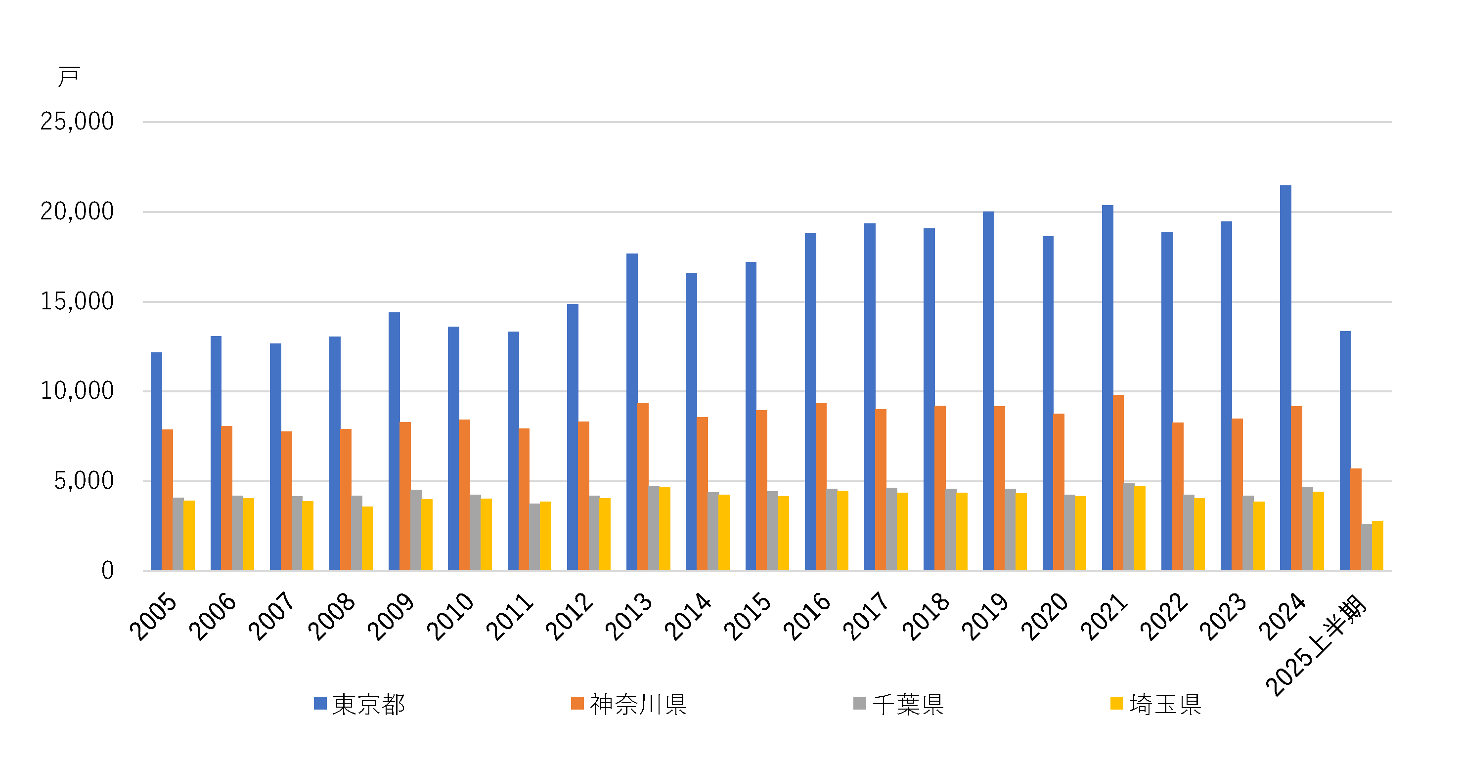 この格差拡大の背景には、東京都における継続的な価格上昇がある。2013年1月を起点とした2025年6月までの累積上昇幅では、東京都が74.90ポイント増と突出している一方、神奈川県35.25ポイント増、千葉県31.97ポイント増、埼玉県32.26ポイント増にとどまっており、上昇ペースの明確な差異が格差拡大の主因となっている。東京都の上昇幅は周辺県の約2倍の水準に達しており、この構造的な格差拡大傾向は2025年上半期においても継続している。