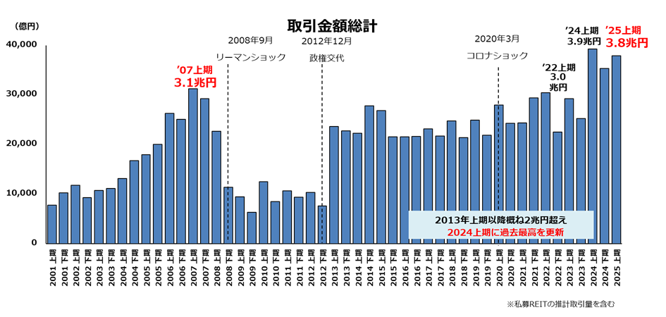不動産取引市場の規模※は、2007上期に約3.1兆円に至ったが、リーマンショックが生じた2008下期には約1兆円程度まで縮小した。2013上期の金融緩和政策開始以降は取引が大幅に増加し、概ね2兆円超えの状況が続いた。2022上期には約3.0兆円に達したが、その後は金利上昇への警戒感などから取引量が減少。もっとも、2024上期は約3.9兆円に達し、2007上期を上回って過去最高額を更新。2025上期も過去2番目に多い3.8兆円に達した。