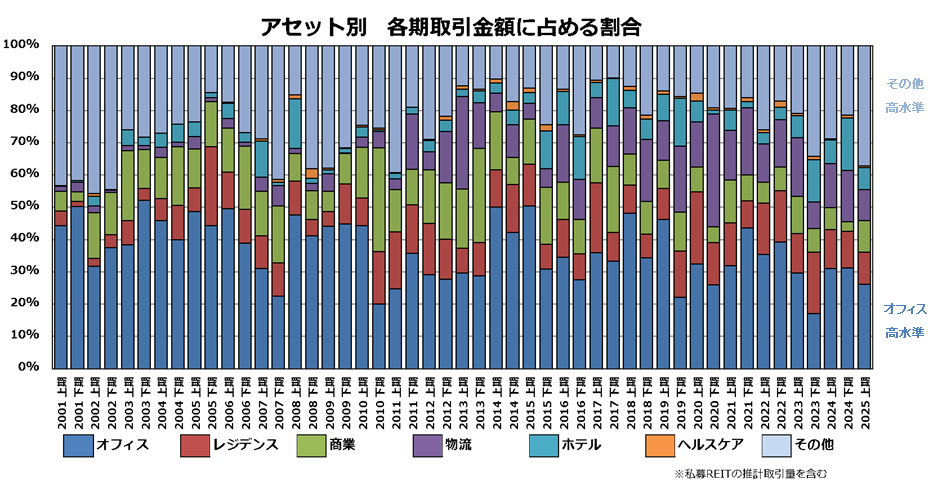 2025上期も賃貸市場の改善が好感され、オフィスの割合が高水準を維持している。一方で、データセンター(DC)に関連する大型投資事例が顕在化し、「その他」アセットの割合も増加している。