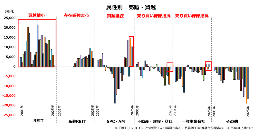 2021年まではJ-REITが一貫して買越を維持し、J-REITへの物件集約が進んだ。J-REITが一度不動産を取得すると、売却するケースは限定される。結果として、取引市場での需給バランスは安定化してきた。 2022年はインベスコオフィスジェイリート投資法人の物件売却や、J-REITの取得金額の減少等により買越が減少。一方で、SPC・AM(私募ファンド等)の買越が大幅増加し、市場の私募化が進むなど新たな動きもみられた。2024年以降はJ-REITの買越額が減少するなか、私募REITの存在感が増している。外資系ファンドを中心にSPC・AMも再び買越に転じ、一般事業法人も売り・買いがほぼ拮抗。2025年に入っても、各プレーヤーの投資意欲は旺盛で、群雄割拠状態が続いている。