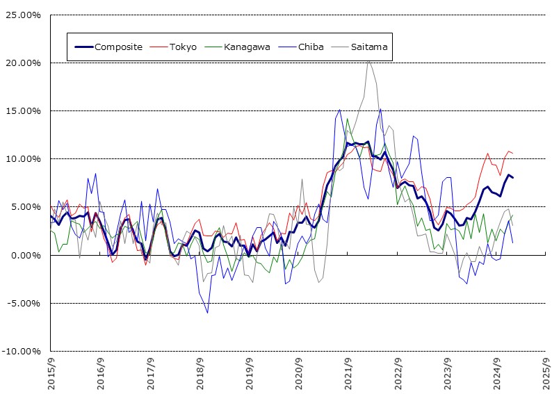 不動研住宅価格指数のうち首都圏総合は140.54ポイント(前月比1.92%)で21ヶ月連続上昇、地域別では、東京が167.33ポイント(前月比2.73%)で13ヶ月連続上昇、神奈川111.82ポイント(前月比0.47%)、千葉95.52ポイント(前月比-1.04%)で2ヶ月連続下落、埼玉97.40ポイント(前月比0.71%)でした。