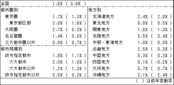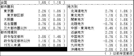 ・都市規模別では、政令指定都市が前回の1.1%上昇から1.8%上昇に拡大、六大都市も1.0%上昇から2.0%上昇に拡大したが、六大都市以外や政令指定都市以外は前回並みの上昇が続いた。