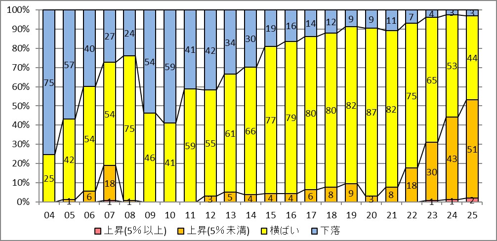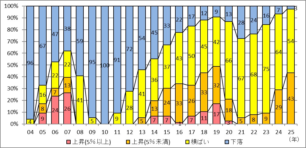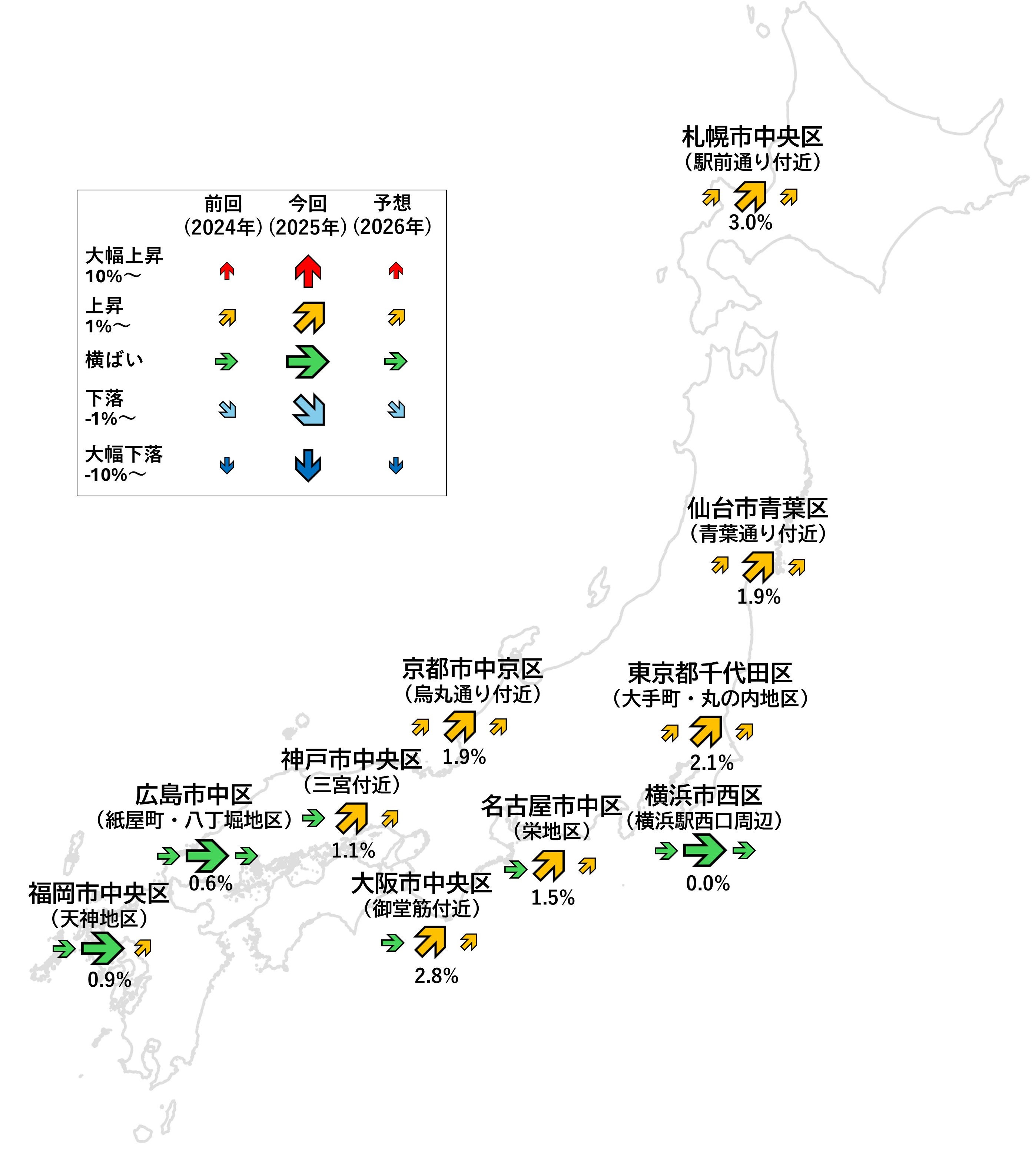 ・全国の主要地点では、大阪市と名古屋市が過去の大量供給から今年は市況が回復し、大阪市は横ばいから2.8%上昇、名古屋市も横ばいから1.5%上昇に転換し、それ以外都市は概ね前回並みの変動率で推移した。