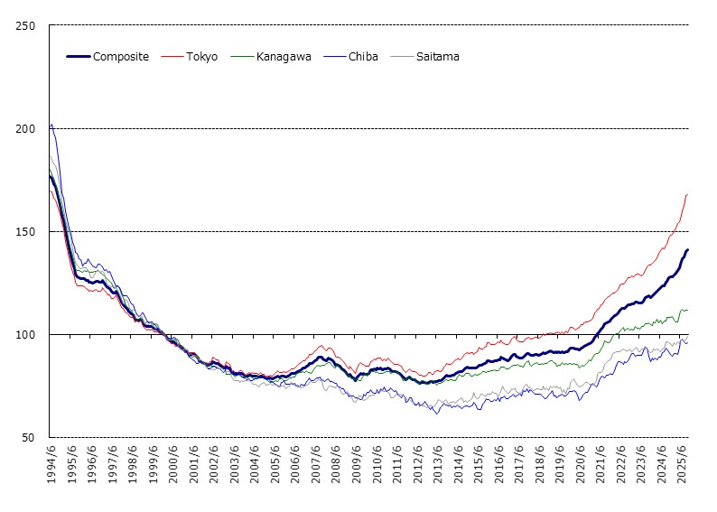 不動研住宅価格指数のうち首都圏総合は141.04ポイント(前月比0.38%)で22ヶ月連続上昇、地域別では、東京が167.82ポイント(前月比0.33%)で14ヶ月連続上昇、神奈川111.79ポイント(前月比-0.02%)、千葉95.99ポイント(前月比0.52%)、埼玉99.02ポイント(前月比1.67%)で2ヶ月連続上昇した。