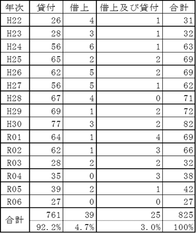 令和6年(以下、「本年」という。)実績として調査対象期間内に定期借地権を活かした事例があると回答した団体数は27となっており、平成22年からの集計期間の中で最も少ない。また、本年は全てが貸付の事例となっており、定期借地権による借上の事例はなかった(図表1)。