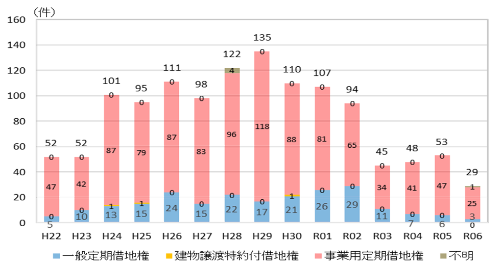 また、本年の各種施設の供給で活用された定期借地権制度は、一般定期借地権が3件、事業用定期借地権が25件となっており(不明は1件)、本年の各種施設の供給においても事業用定期借地権が主に活用されている。