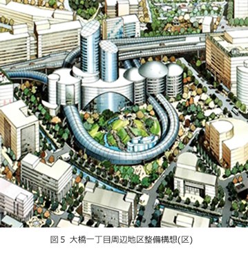 道路計画が決定され地元は大きな衝撃を受けた。さらなる環境悪化と、当地に住み続けられないとの不安からだ。これに、区は平成4年10月、「大橋一丁目周辺地区整備構想(案)」を作成し、周辺住民等に説明会を行った。[図5]