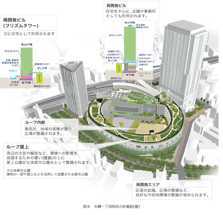 大橋地区まちづくりは、首都高ジャンクションと東京都の市街地再開発事業による2棟のビルを中心に、半径300mエリアでの目黒区の地区整備事業等からなる。